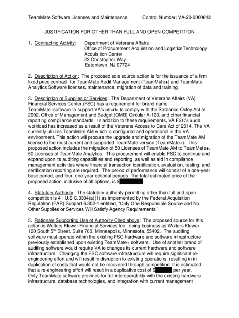 Teammate Software Licenses and MaintenanceControl Number: VA200000842JUSTIFICATION FOR OTHER THAN FULL AND OPEN COMPETITION 1. Contracting Activity:Department of Veterans Affairs Office of Procurement