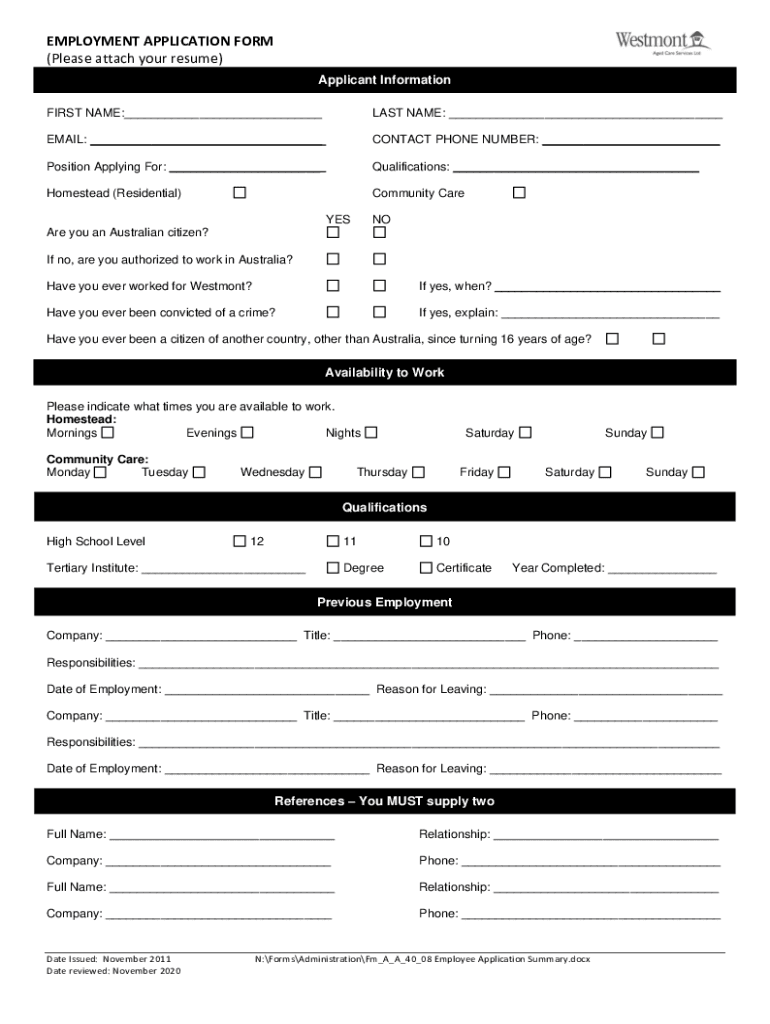 EMPLOYMENT APPLICATION FORM (Please attach your resume) Applicant Information FIRST NAME:___LAST NAME: ___EMAIL: ___CONTACT PHONE NUMBER: ___Position Applying For: ___Qualifications: ___Homestead