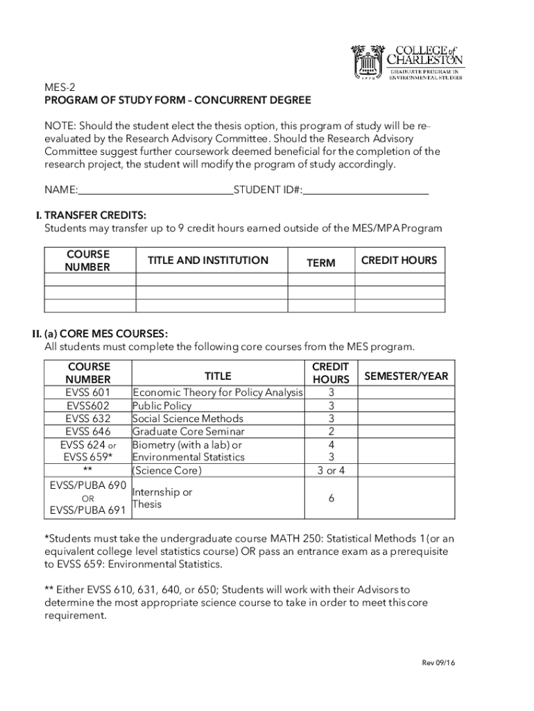 MES2 PROGRAM OF STUDY FORM CONCURRENT DEGREE NOTE: Should the student elect the thesis option, this program of study will be reevaluated by the Research Advisory Committee. Should the Research Advisory