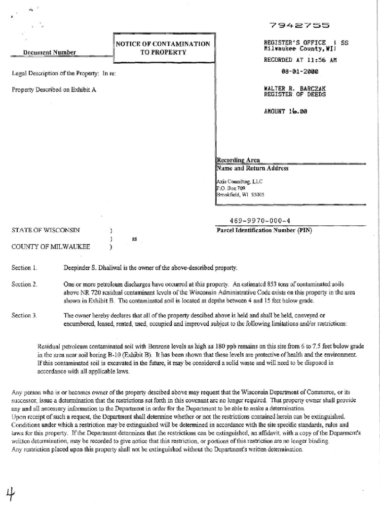 .;.7942755REGISTER\'S OFFICE I SS Milwaukee County, WII RECORDED AT 11:56 NOTICE OF CONTAMINATION TO PROPERTYDocument Number08012000Legal Description of the Property: In re:WALTER R. BARCLAY REGISTER