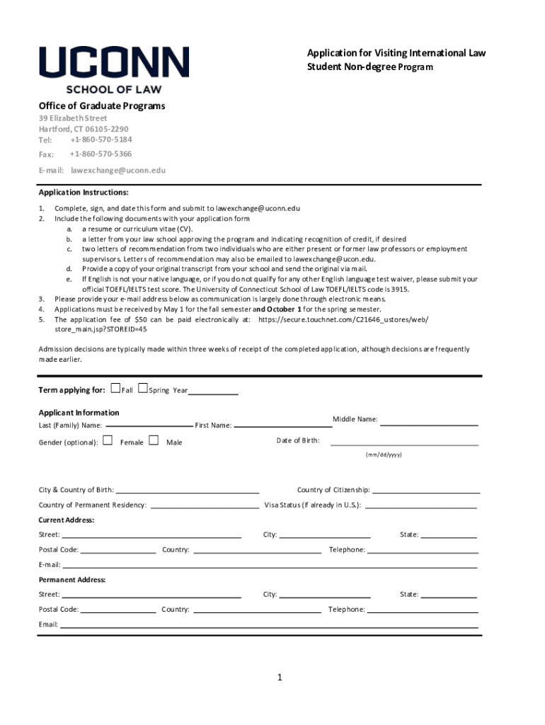 Application for Visiting International Law Student Nondegree Program Office of Graduate Programs39 Elizabeth Street Hartford, CT 061052290 Tel: +18605705184+18605705366Fax:Email: law exchange×Conn.edu