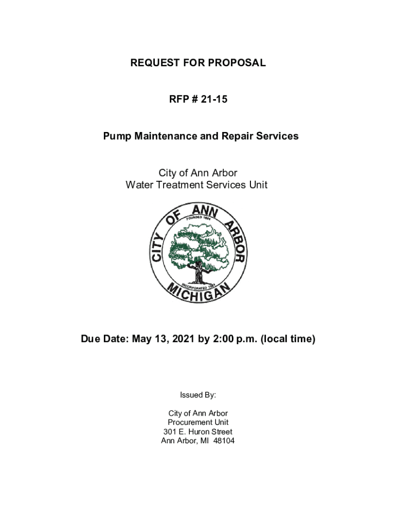 REQUEST FOR PROPOSAL RFP # 2115 Pump Maintenance and Repair Services City of Ann Arbor Water Treatment Services Unique Date: May 13, 2021, by 2:00 p.m. (local time×Issued By: City of Ann Arbor Procurement