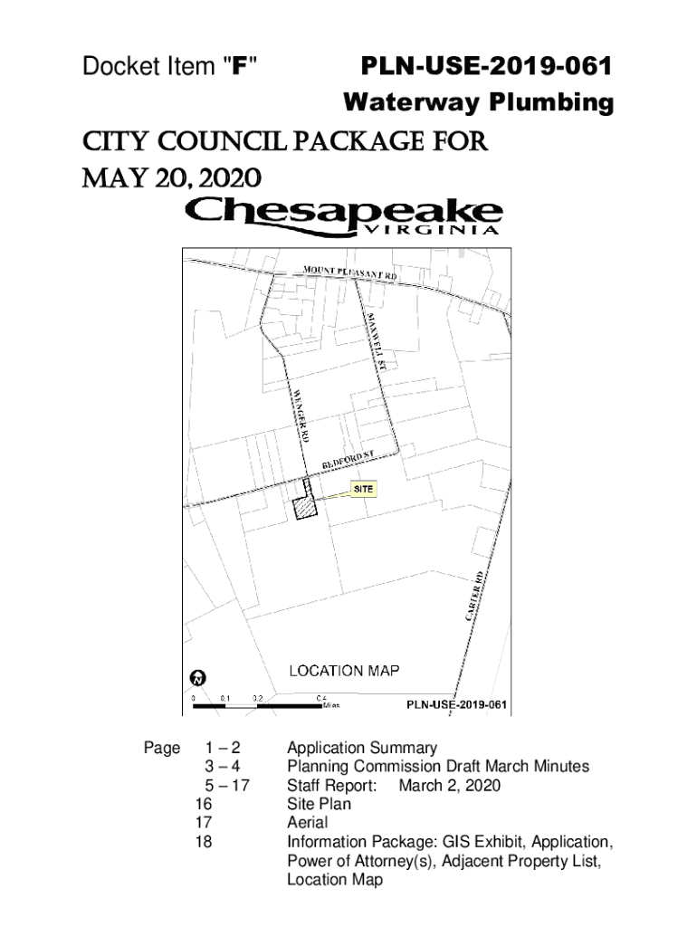 Docket Item \” F\” PLNUSE2019061 Waterway PlumbingCITY COUNCIL PACKAGE FOR May 20, 2020Page12 34 5 17 16 17 18Application Summary Planning Commission Draft March Minutes Staff Report: March 2,