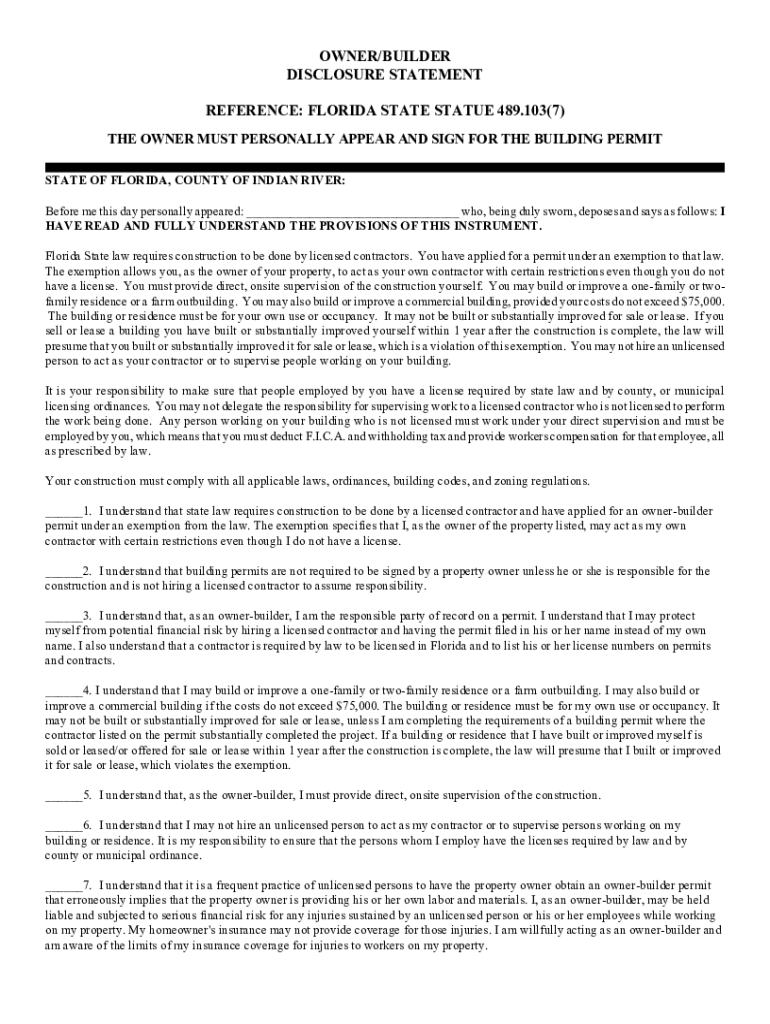 OWNER×BUILDER DISCLOSURE STATEMENT REFERENCE: FLORIDA STATE STATUE 489.103×7) THE OWNER MUST PERSONALLY APPEAR AND SIGN FOR THE BUILDING PERMIT STATE OF FLORIDA, COUNTY OF INDIAN RIVER: Before me