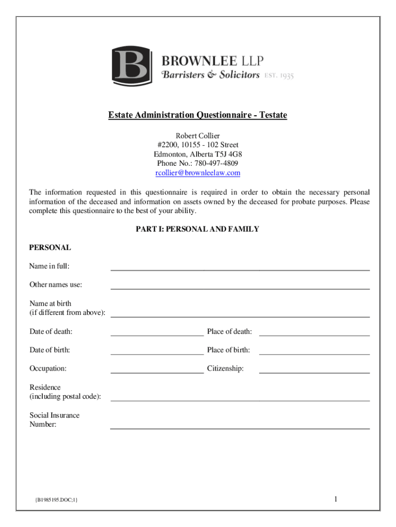 Estate Administration Questionnaire Testate Robert Collier #2200, 10155 102 Street Edmonton, Alberta T5J 4G8 Phone No.: 7804974809 Collier×brownleelaw.com The information requested in this questionnaire