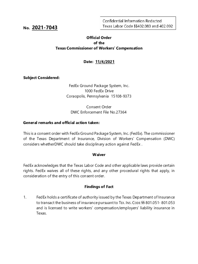 No. Information Redacted Texas Labor Code 402.083 and 402.09220217043Official Order of the Texas Commissioner of Workers Compensation Date: 11×4/2021 Subject Considered: FedEx Ground Package System,