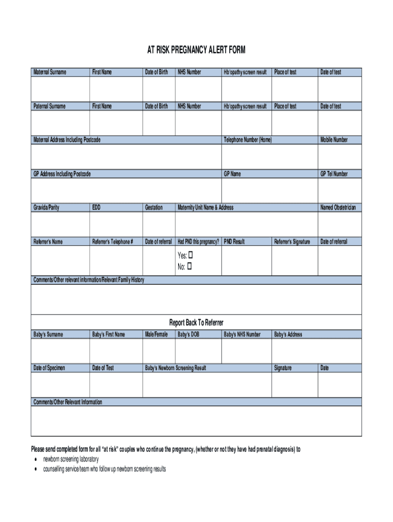 AT RISK PREGNANCY ALERT FORM Maternal SurnameFirst Name Date of Birth NHS NumberHbopathy screen resultPlace of testate of testPaternal SurnameFirst Name Date of Birth NHS NumberHbopathy screen resultPlace