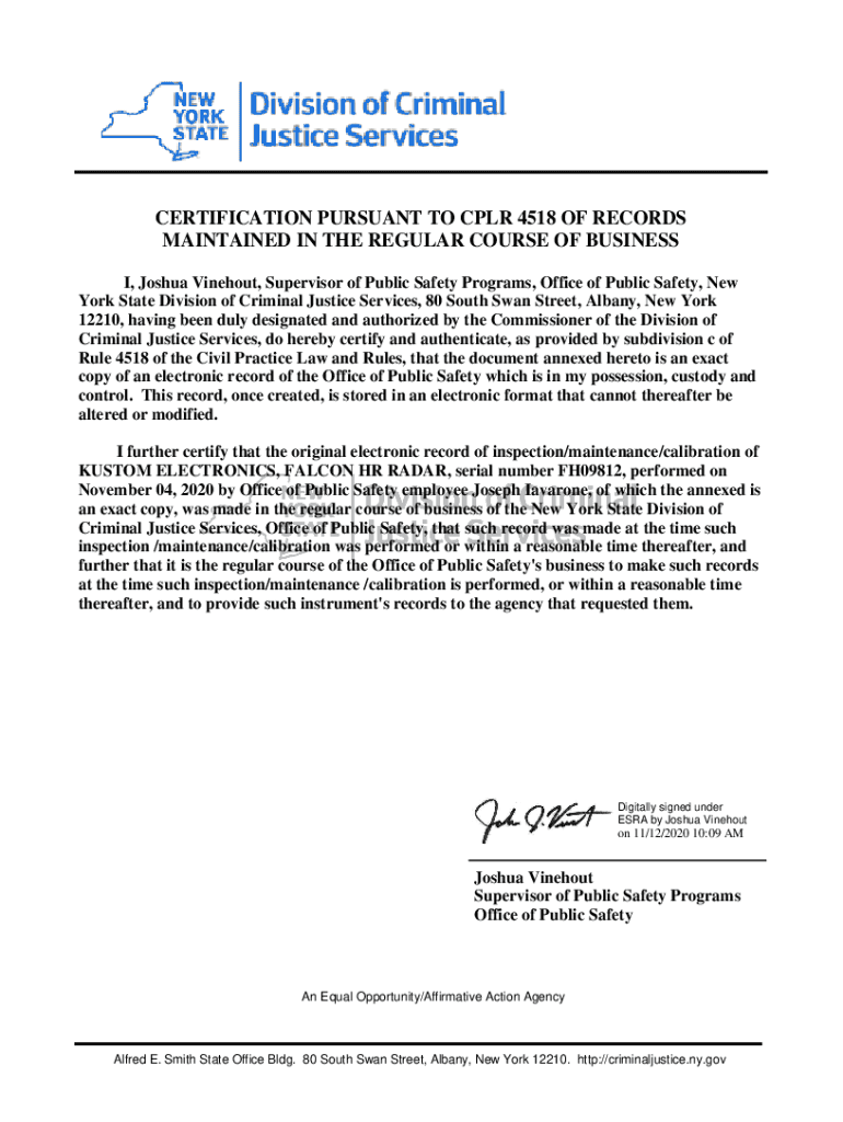 CERTIFICATION PURSUANT TO CPR 4518 OF RECORDS MAINTAINED IN THE REGULAR COURSE OF BUSINESS I, Joshua Without, Supervisor of Public Safety Programs, Office of Public Safety, New York State Division