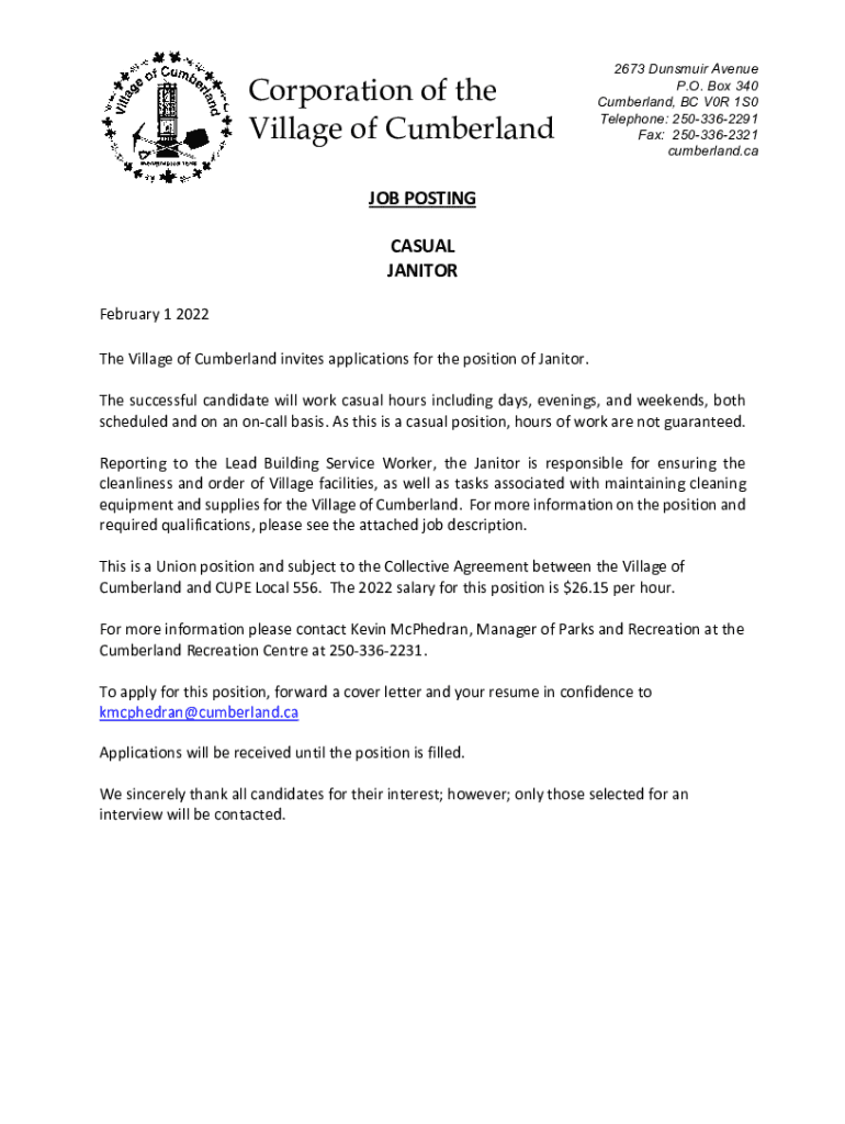 Corporation of the Village of Cumberland2673 Langmuir Avenue P.O. Box 340 Cumberland, BC V0R 1S0 Telephone: 2503362291 Fax: 2503362321 Cumberland. Carob POSTING CASUAL JANITOR February 1, 2022, The