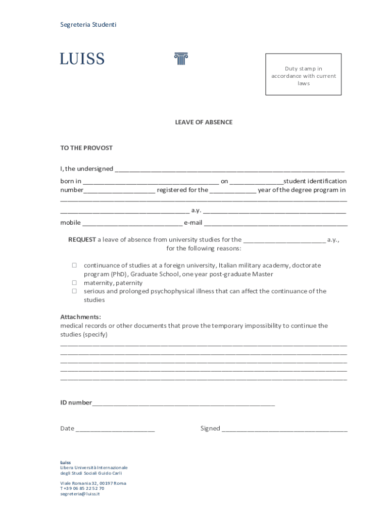 Secretariat StudentiDuty stamp in accordance with current lawsLEAVE OF ABSENCE TO THE PROVOST I, the undersigned ___ born in ___ on ___student identification number___ registered for the ___ year