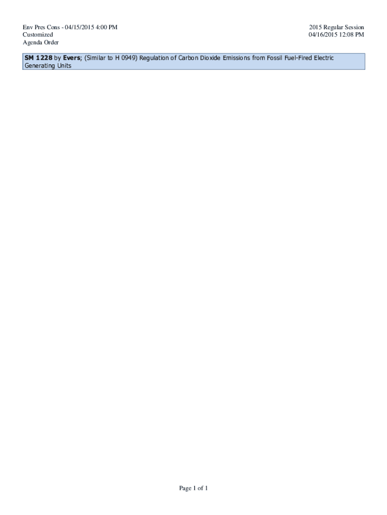 Env Pres Cons 04×15/2015 4:00 PM Customized Agenda Order2015 Regular Session 04×16/2015 12:08 PMS 1228 by Every; (Similar to H 0949) Regulation of Carbon Dioxide Emissions from Fossil Fueled Electric