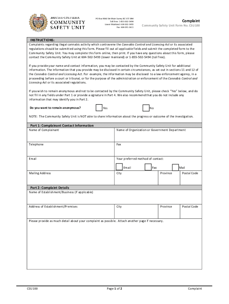 PO Box 9060 STN Main Surrey BC V3T 0N4 Toll Free: 18555025494 Lower Mainland: 6045025493 Fax: 6045915611ComplaintCommunity Safety Unit Form No. CSU100INSTRUCTIONS: Complaints regarding illegal cannabis
