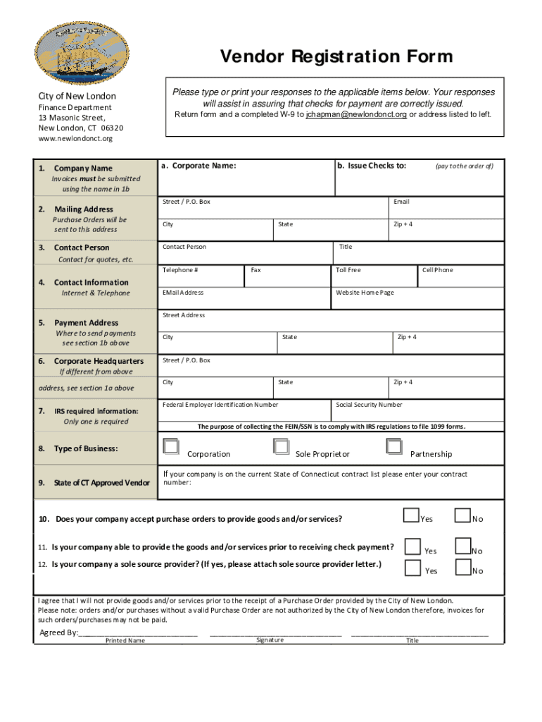 Vendor Registration Form City of New LondonFinance Department 13 Masonic Street, New London, CT 06320Please type or print your responses to the applicable items below. Your responses will assist in