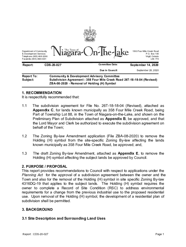 Department of Community & Development Services Telephone (905× 4683266 Facsimile (905) 4680301Report:1593 Four Mile Creek Road P.O. Box 100 Virgil, Ontario L0S 1T0CDS20027Report To: Subject:Committee
