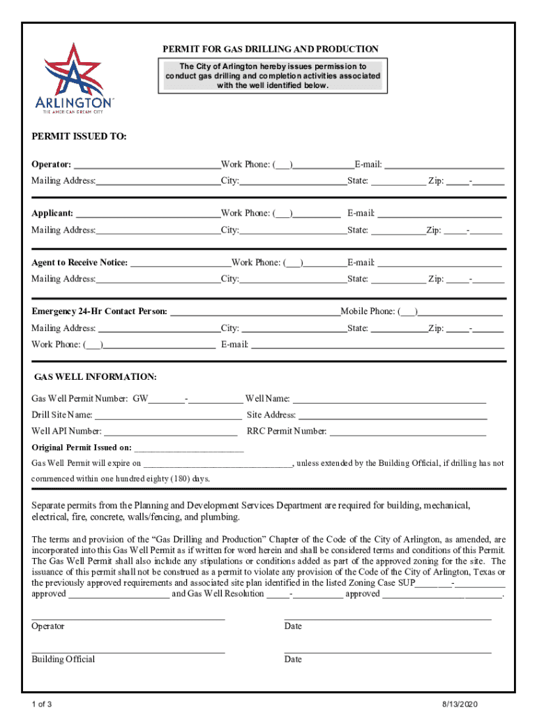 PERMIT FOR GAS DRILLING AND PRODUCTION The City of Arlington hereby issues permission to conduct gas drilling and completion activities associated with the well identified below. PERMIT ISSUED TO: