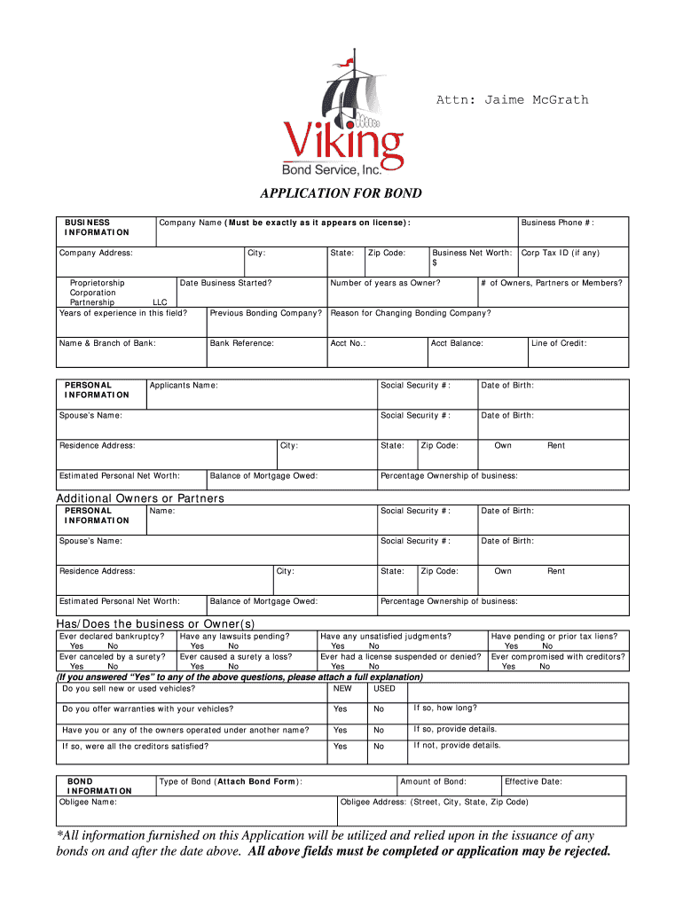 Anyone seeking a surety bond from Viking Bond Service is required to file the Viking Bond application.