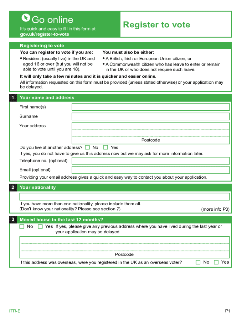 Go onlineRegister to votes quick and easy to fill in this form at gov.UK×registertovote Registering to vote You can register to vote if you are: Resident (usually live) in the UK and aged 16 or over