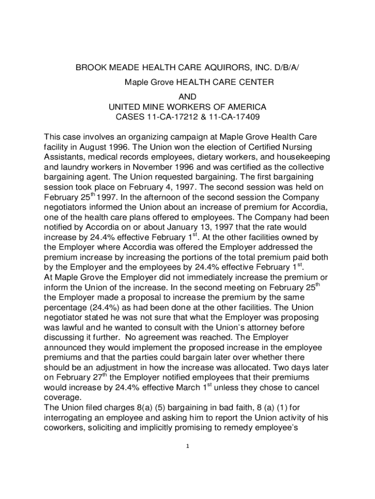 BROOK MEADE HEALTH CARE AQUIFERS, INC. D×B/A/ Maple Grove HEALTH CARE CENTER AND UNITED MINE WORKERS OF AMERICA CASES 11CA17212 & 11CA17409 This case involves an organizing campaign at Maple Grove