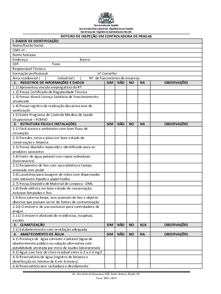 Secretariat de Sade Secretariat Executive de Vigilncia em Sade Garcia de Vigilncia Santeria do RecifeROTEIRO DE INSPECT EM CONTROLADORA DEP RAGAS I. DADO SDE IDENTIFIED Nome/Razor Social: CNJ n.: