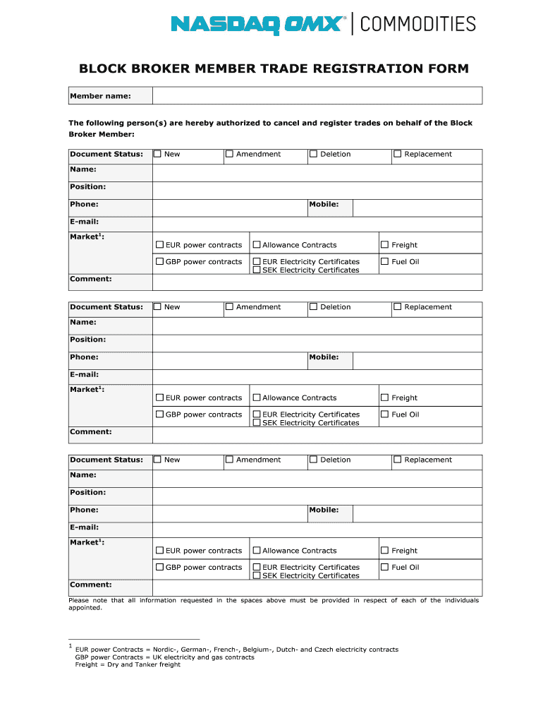 Get the free Block broker member trade registration form - Nasdaq OMX