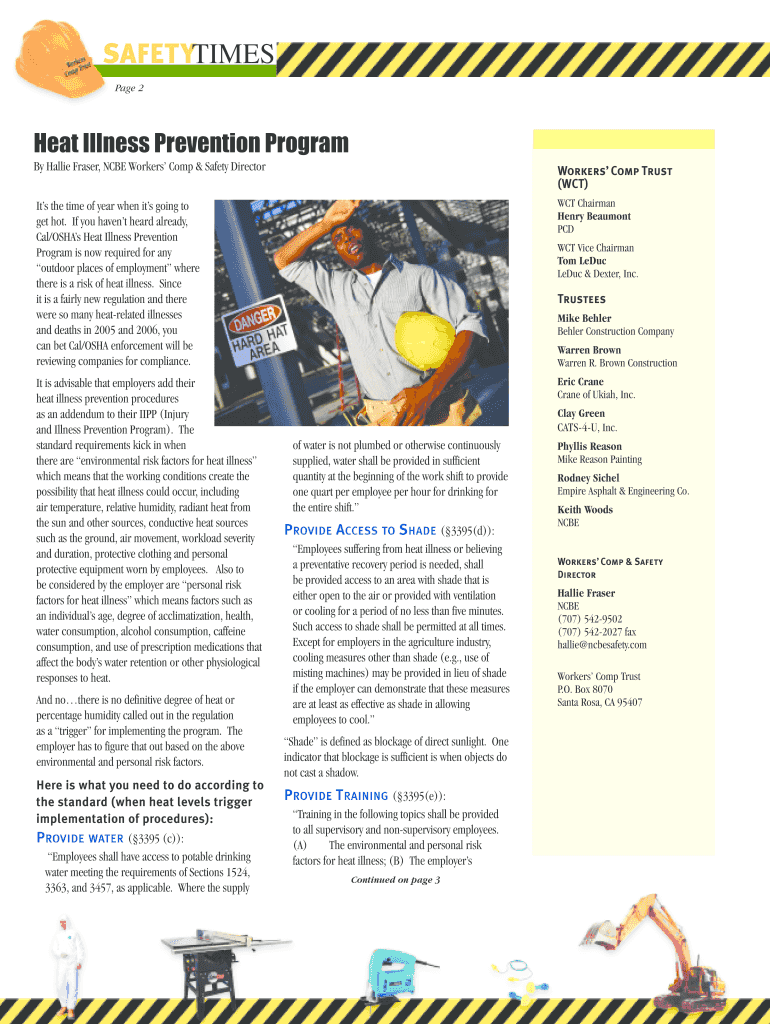 SAFETIES Page 2 Heat Illness Prevention Program By Hallie Fraser, CBE Workers Comp & Safety Director Workers Comp Trust (WCT) It's the time of year when it's going to get hot. If you haven't heard