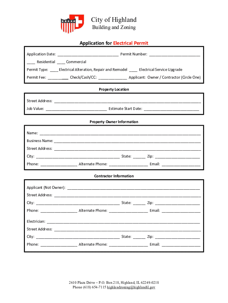 City of Highland Building and Zoning Application for Electrical Permit Application Date: ___ Permit Number: ___ ___ Residential ___ Commercial Permit Type: ___ Electrical Alteration, Repair and Remodel
