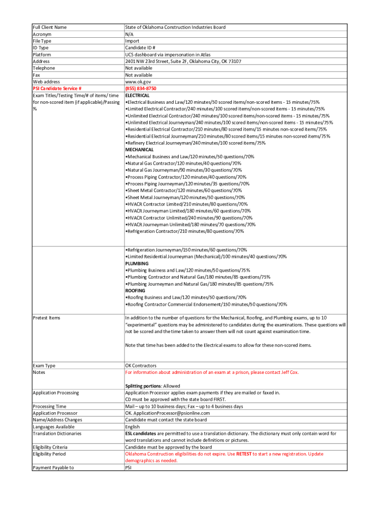 Full Client Name Acronym File Type ID Type Platform Address Telephone Fax Web address PSI Candidate Service # Exam Titles×Testing Time/# of items/ time for nonscored item (if applicable)/Passing