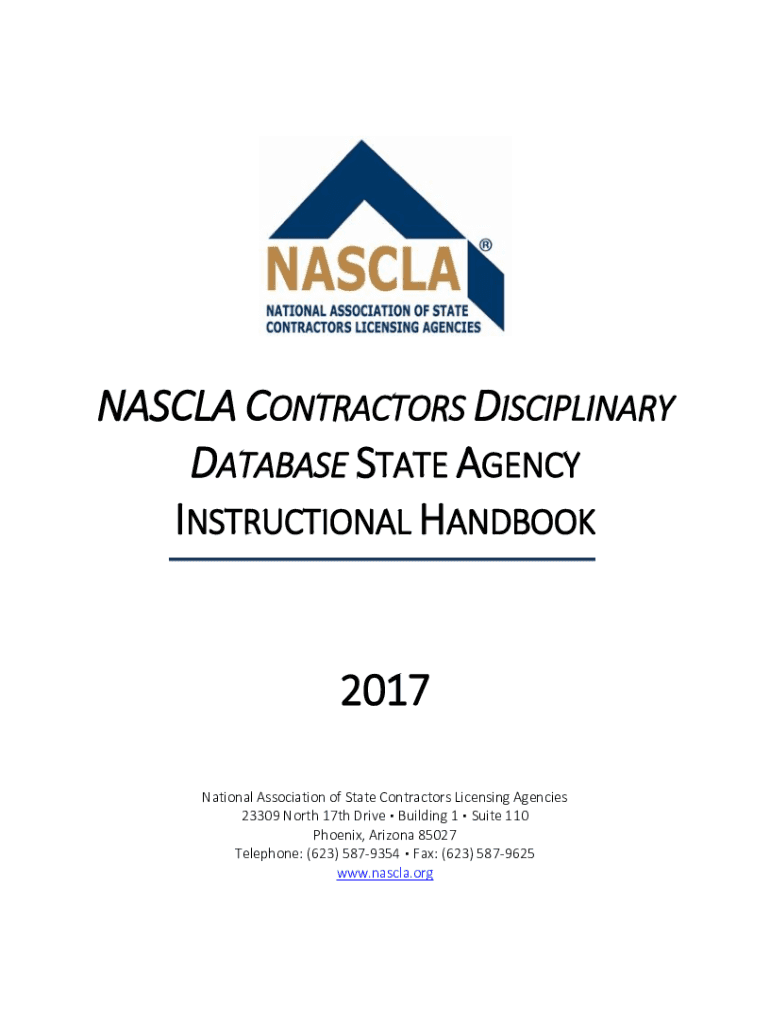 NAS CLA CONTRACTORS DISCIPLINARY DATABASE STATE AGENCY INSTRUCTIONAL HANDBOOK2017 National Association of State Contractors Licensing Agencies 23309 North 17th Drive Building 1 Suite 110 Phoenix,