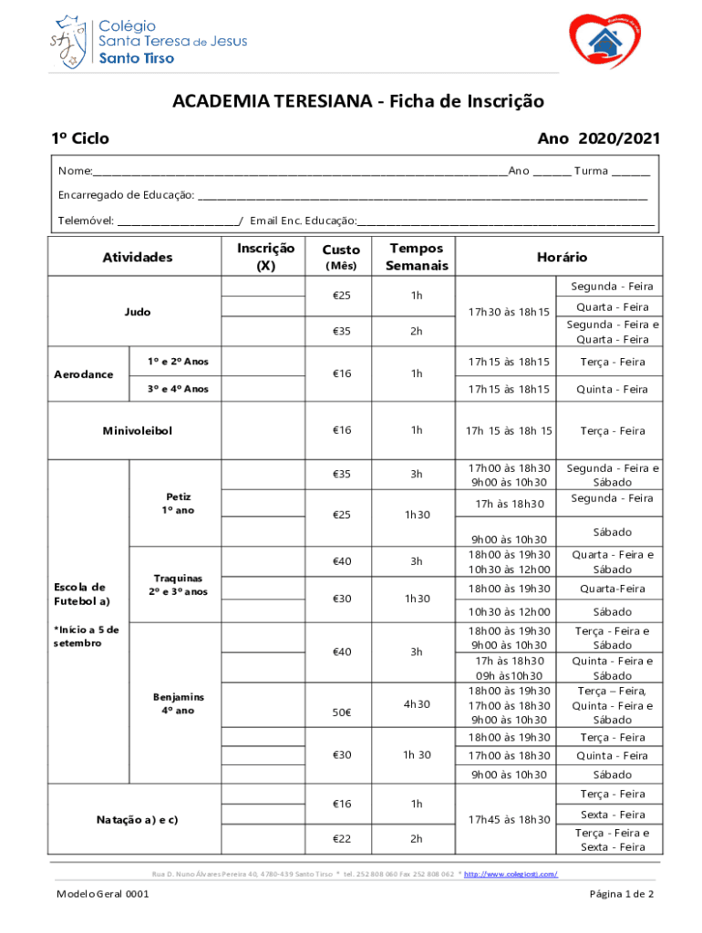 ACADEMIA TERESINA FICA de Inscrio 1 Cyclone 2020×2021Nome:___ANO ___ Burma ___ Encarregado de Educao: ___ Level: ___/ Email Enc. Educator:___AtividadesInscrio (X)(Ms×Tempos Semanais251hCustoJudoAerodanceSegunda
