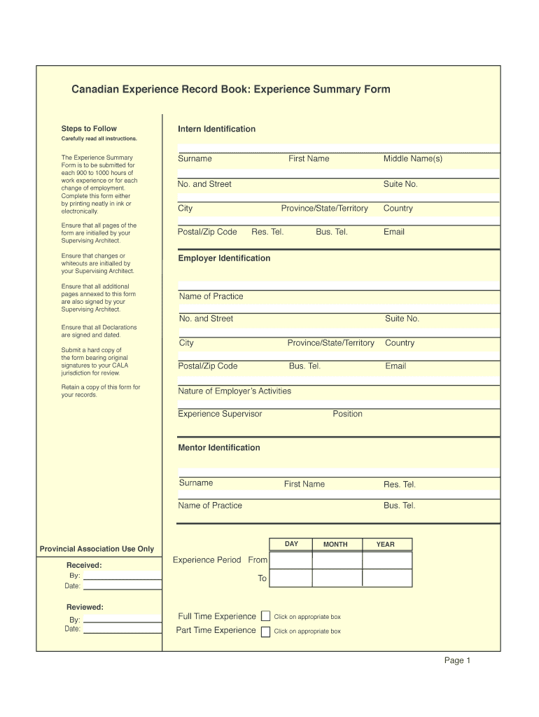 Appendix F VERB ALL FORMS Canadian Experience Record Book: Experience Summary Form Steps to Follow Intern Identity cation Carefully read all instructions. Surname The Experience Summary Form is to
