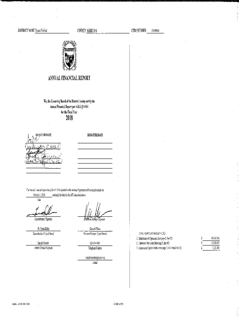DISTRICT NAME _Dy×SART×U_n×i_fi×ed_ _ _ _ _ _ _ __CDs NUMBERCOUNTY MARICOPA070289000 ANNUAL FINANCIAL Report, the Governing Board of the District, hereby certify the Annual Financial Report per