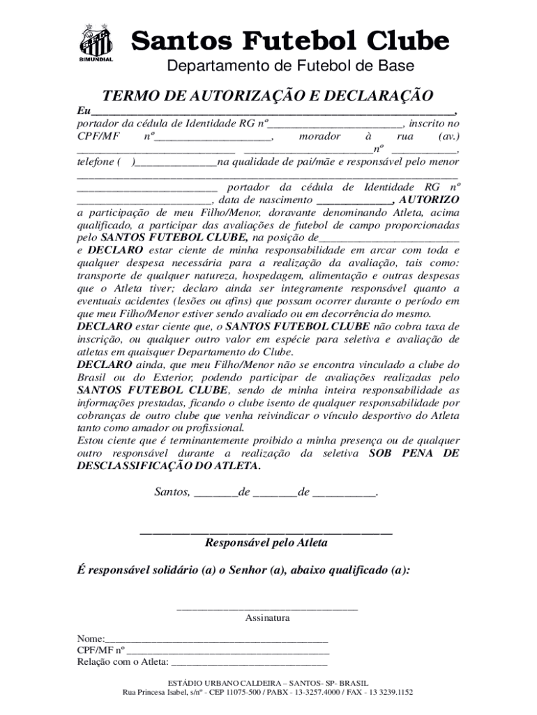 Santos Fuel Club Department de Futebol de Base TERM ODE AUTHORIZED E DECLARED Eu___, toreador the could DE Identified KG n___, inscribe no CPF×MF n___, Mordor RUA (av.) ___ ___n ___, telephone ()___Na