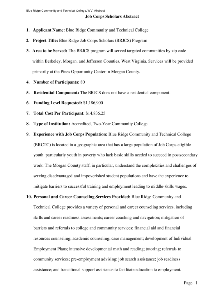 Blue Ridge Community and Technical College, WV, Abstract Job Corps Scholars Abstract 1. Applicant Name: Blue Ridge Community and Technical College 2. Project Title: Blue Ridge Job Corps Scholars (BRICS)