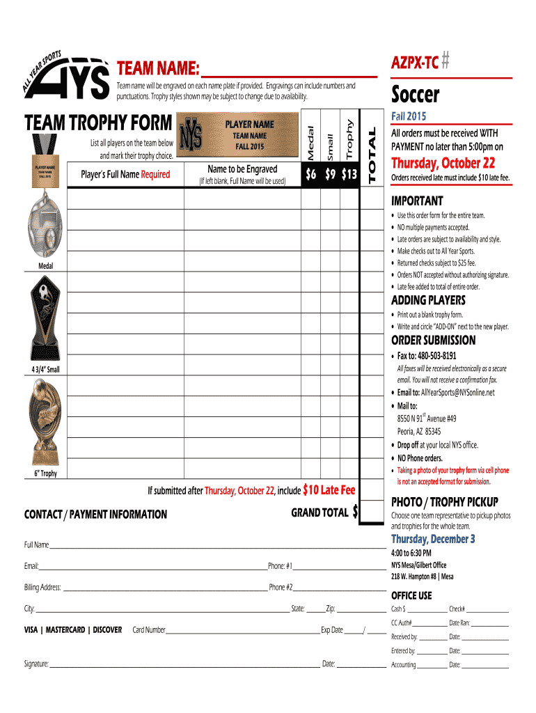 TEAM NAME: Player s Full Name Required Name to be Engraved (If left blank, Full Name will be used) Small List all players on the team below and mark their trophy choice. $$$6913 Soccer Spring 2015