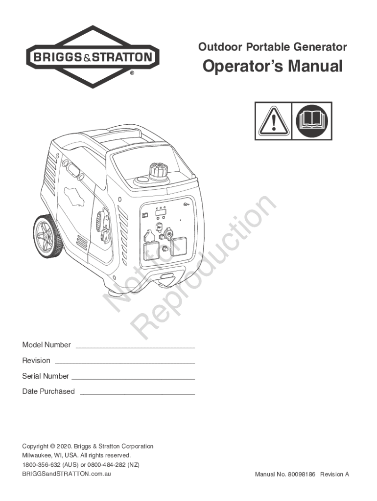 Outdoor Portable Generator o R TF EP o r RO duct cooperators ManualModel Number ___ Revision ___ Serial Number ___ Date Purchased ___Copyright 2020. Briggs & Stratton Corporation Milwaukee, WI, USA.