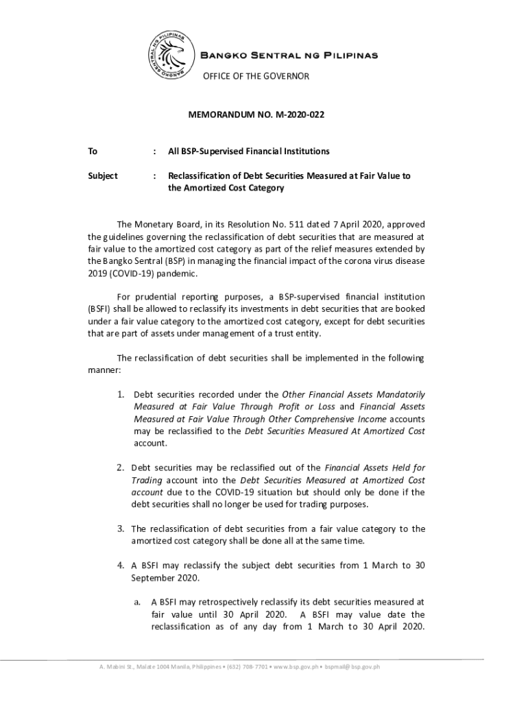 AnnAnnever11a 60OFFICE OF THE GOVERNORMEMORANDUM NO. M2020022To:All Supervised Financial InstitutionsSubject:Reclassification of Debt Securities Measured at Fair Value to the Amortized Cost Category