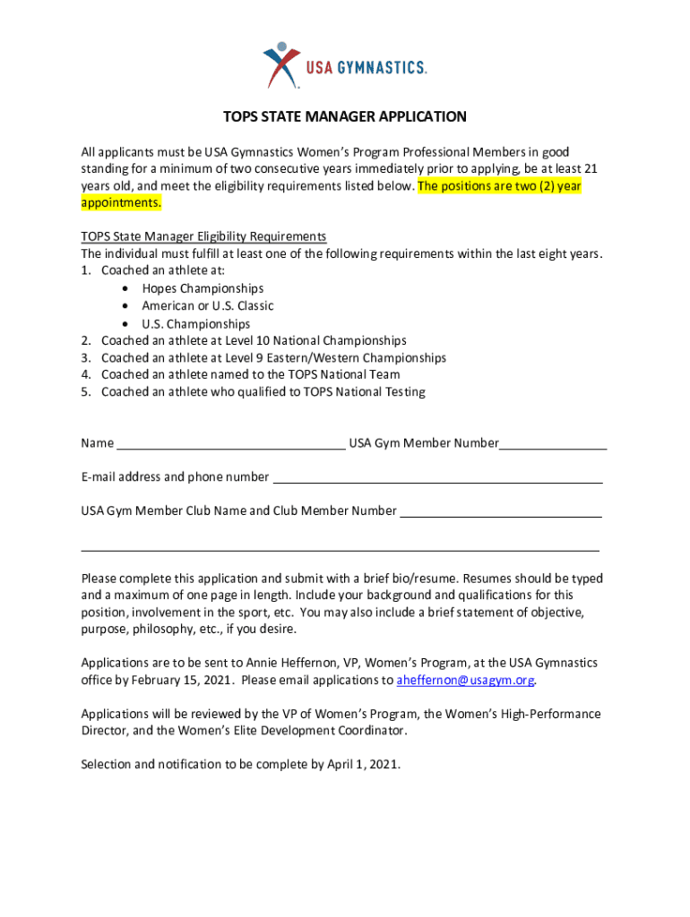 TOPS STATE MANAGER APPLICATION All applicants must be USA Gymnastics Women's Program Professional Members in good standing for a minimum of two consecutive years immediately prior to applying, be