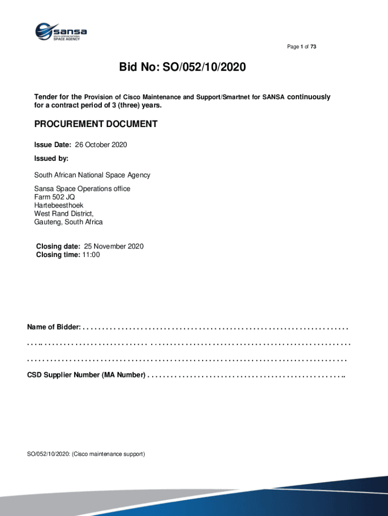 Page 1 of 73Bid No: SO×052×10×2020 Tender for the Provision of Cisco Maintenance and Support×Smart net for SANTA continuously for a contract period of 3 (three) years. PROCUREMENT DOCUMENT Issue