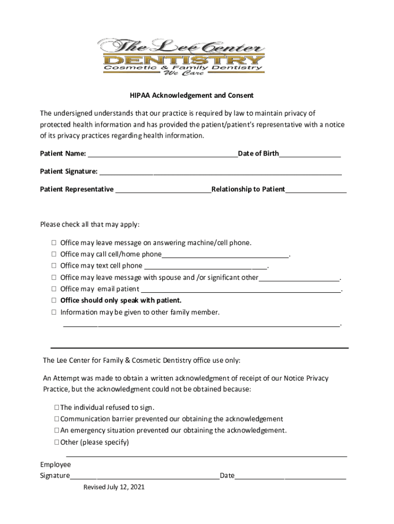 HIPAA Acknowledgement and Consent The undersigned understands that our practice is required by law to maintain privacy of protected health information and has provided the patient×patients representative