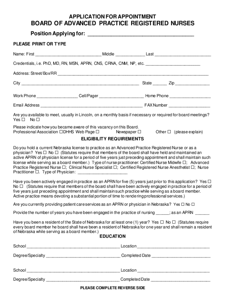 APPLICATION FOR APPOINTMENTBOARD OF ADVANCED PRACTICE REGISTERED NURSES Position Applying for: ___ PLEASE PRINT OR TYPE Name: First ___ Middle ___ Last ___ Credentials, i.e. PhD, MD, RN, MSN, APRN,