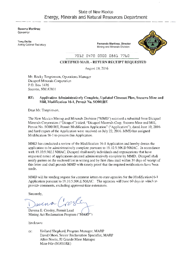 State of New MexicoEnergy, Minerals and Natural Resources Department Susana Martinez Govern or Tony Delphi Acting Cabinet Secretary Fernando Martinez, Director Mining and Minerals Division7012 04