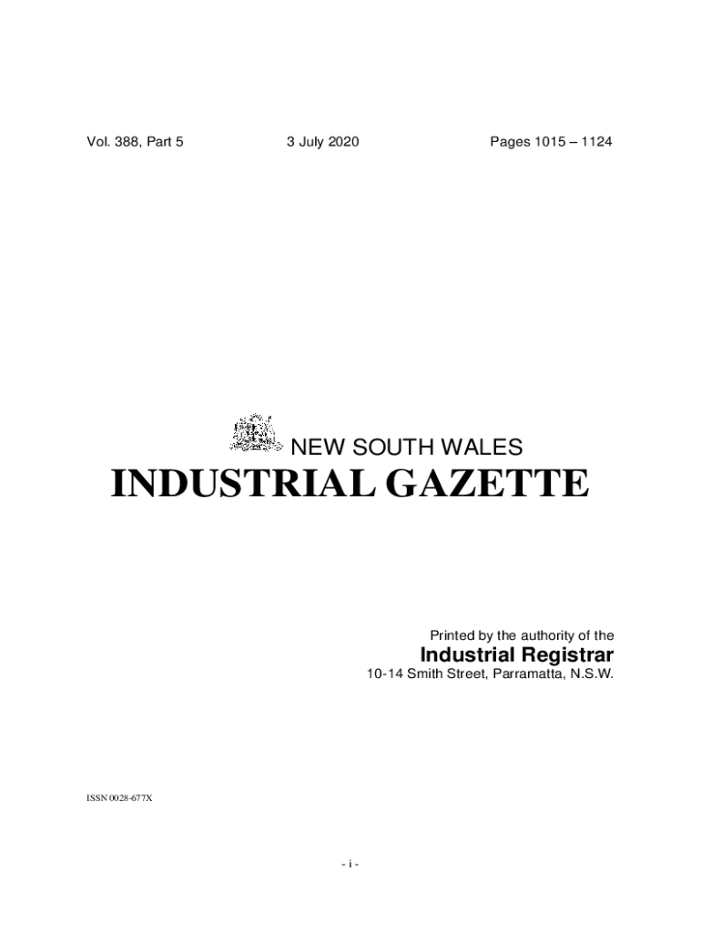 Vol. 388, Part 53 July 2020Pages 1015 1124NEW SOUTH WALESINDUSTRIAL GAZETTEPrinted by the authority of preindustrial Registrar 1014 Smith Street, Parramatta, N.S.W.ISSN 0028677XiCONTENTS Vol. 388,