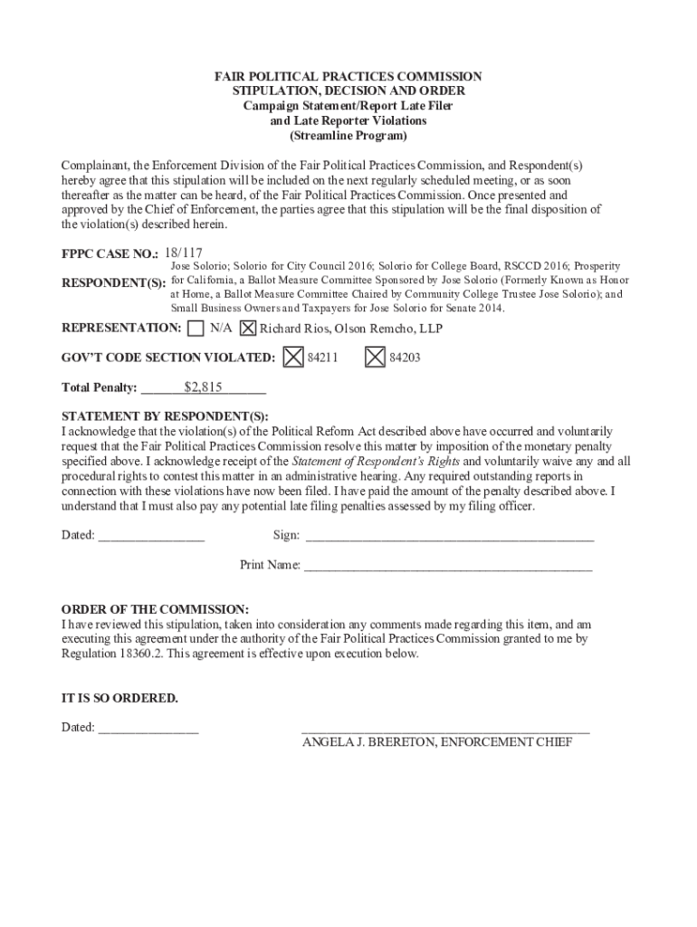 FAIR POLITICAL PRACTICES COMMISSION STIPULATION, DECISION AND ORDER Campaign Statement×Report Late Filer and Late Reporter Violations (Streamline Program) Complainant, the Enforcement Division of