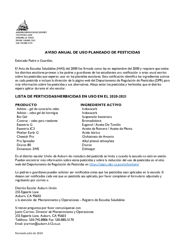 AVIS ANNUAL DE USO PLANED DE PESTICIDES Estimate Padre o Guardian, El ACTA de Escuelas Valuables (HAS) Del 2000 due Narmada Como La en September Del 2000 y require Que to-dos Los districts escolars