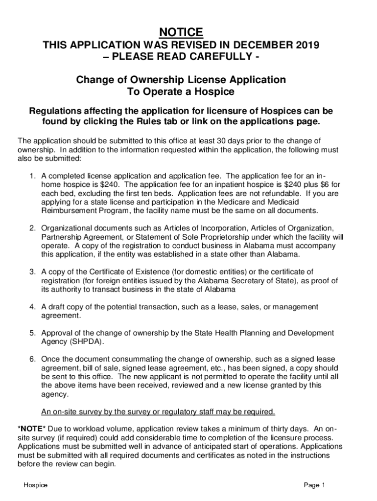 NOTICE THIS APPLICATION WAS REVISED IN DECEMBER 2019 PLEASE READ CAREFULLY Change of Ownership License Application To Operate a Hospice regulation affecting the application for licensure of Hospices