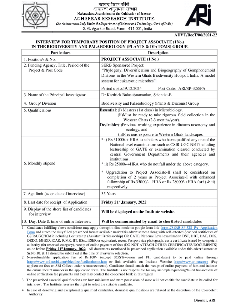 G. G. Agarwal Road, Pune 411 004, India ADVT×Rest×06×202122 INTERVIEW FOR TEMPORARY POSITION OF PROJECT ASSOCIATE (1No.) IN THE BIODIVERSITY AND PALEONTOLOGY (PLANTS & DIATOMS) GROUP. Particulars