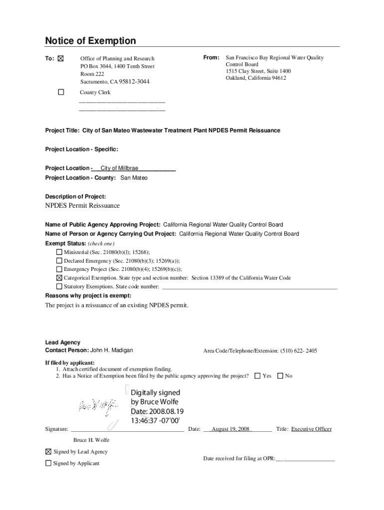 Notice of Exemption To:Office of Planning and Research PO Box 3044, 1400 Tenth Street Room 222 Sacramento, CA 958123044From:San Francisco Bay Regional Water Quality Control Board 1515 Clay Street,