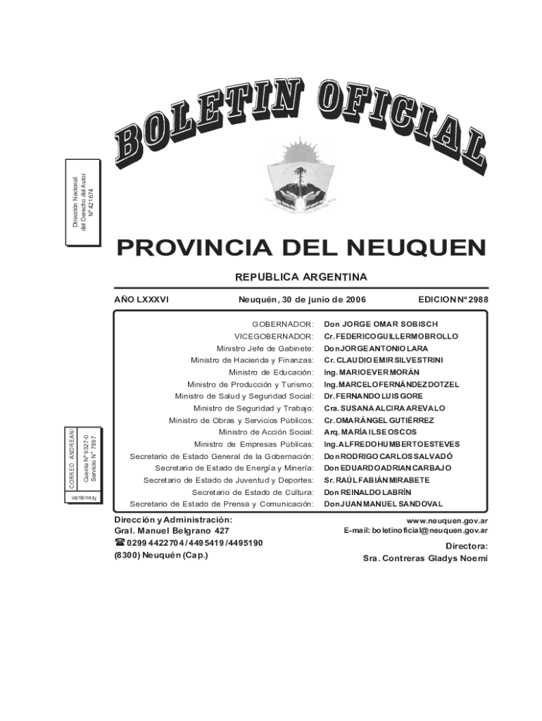 BOLTON OFICIALPAGINA 1Direccin Nacional del Each Del Actor N 421674Neuqun, 30 DE junior de 2006PROVINCIA DEL SEQUEL REPUBLICAN ARGENTINA AO LXXXVINeuqun, 30 DE junior DE 2006 GOVERNOR: VICEGOBERNADOR: