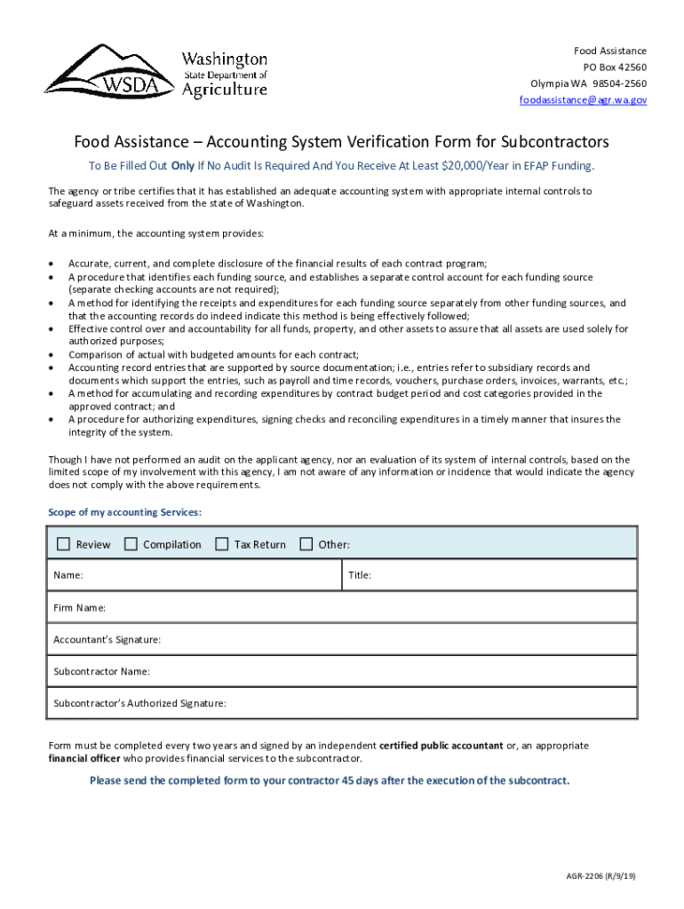 Food Assistance PO Box 42560 Olympia WA 985042560 food assistance×AGR. Wei.godhood Assistance Accounting System Verification Form for Subcontractors To Be Filled Out Only If No Audit Is Required