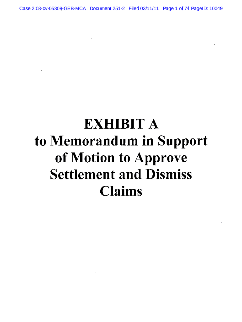 Case 2:03cv05309GEBMCA Document 2512 Filed 03×11/11-Page 1 of 74 Paged: 10049EXHIBIT A to Memorandum in Support of Motion to Approve Settlement and Dismiss Claims Case 2:03cv05309GEBMCA Document